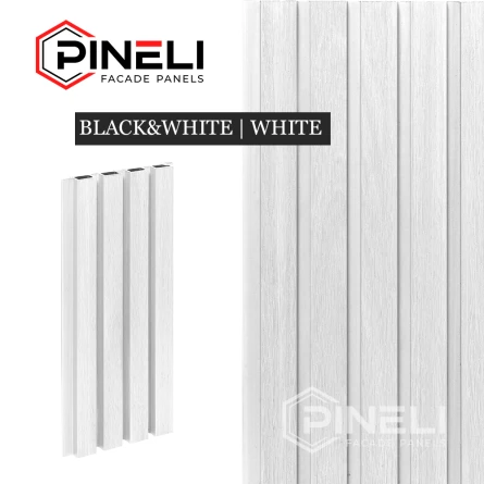 Реечные фасадные панели «Pineli Black&White», как и все стеновые панели Pineli изготовлены из дпк (древесно-полимерного композита) с применением инновационной технологии производства "CO-EXTRUSION". Основной материал покрыт специальным защитным слоем, который на 100% защищает панели от УФ и негативного воздействию внешних факторов.