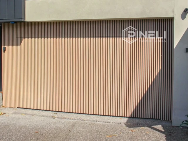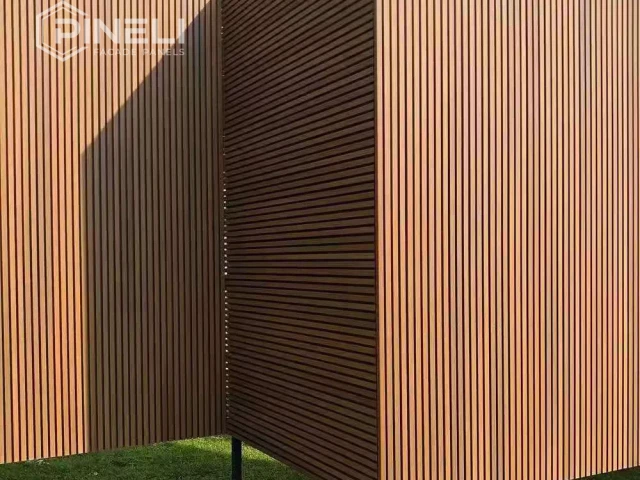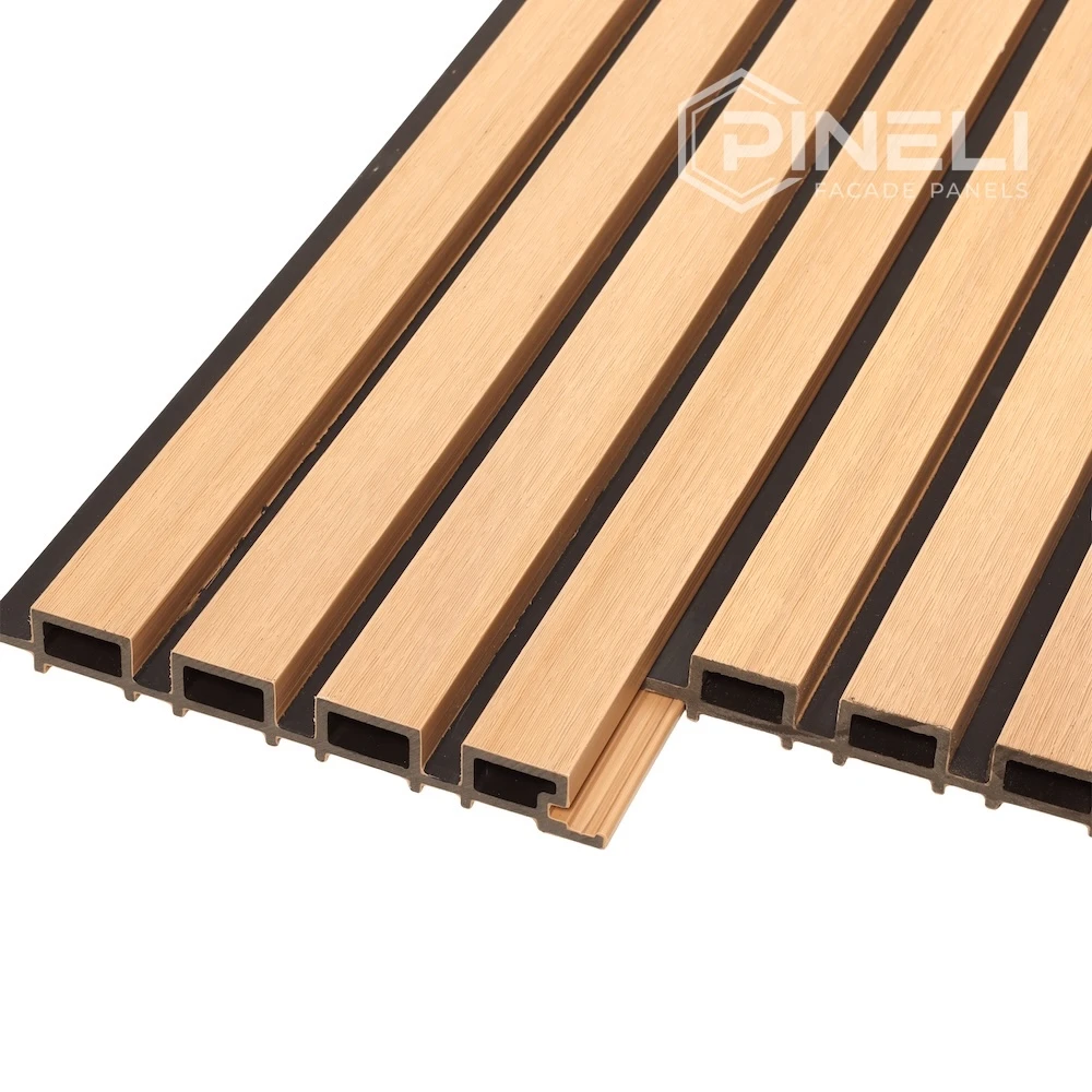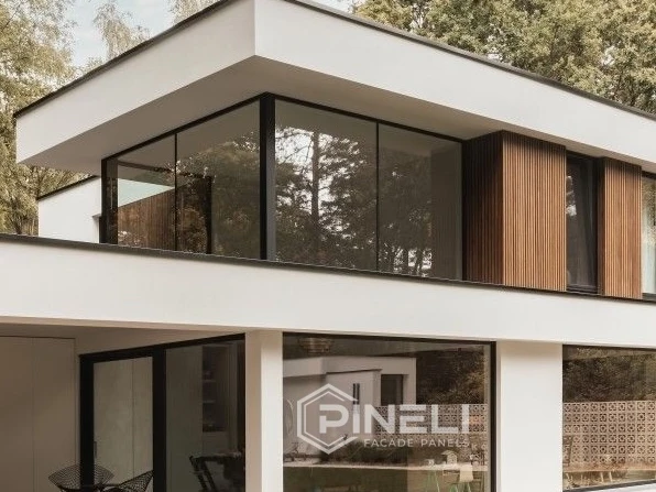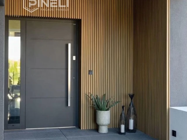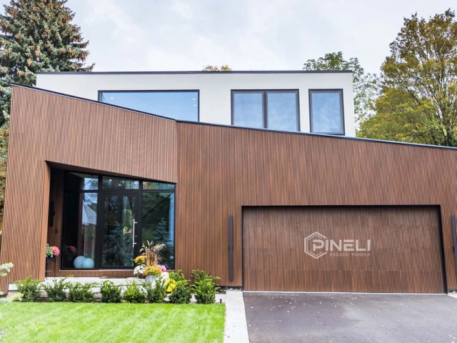 Фасадные панели Pineli Bicolor Sandy (Песочный) выполнены в виде реек, при этом имитирует древесную фактуру и цвета различных пород древесины. Уникальные расцветки панелей в сочетании двух цветов, где графитовый цвет между реек создает глубину и объем в любом пространстве, открывает безграничные возможности для игры с глубиной и объемом вашего фасада и проекта