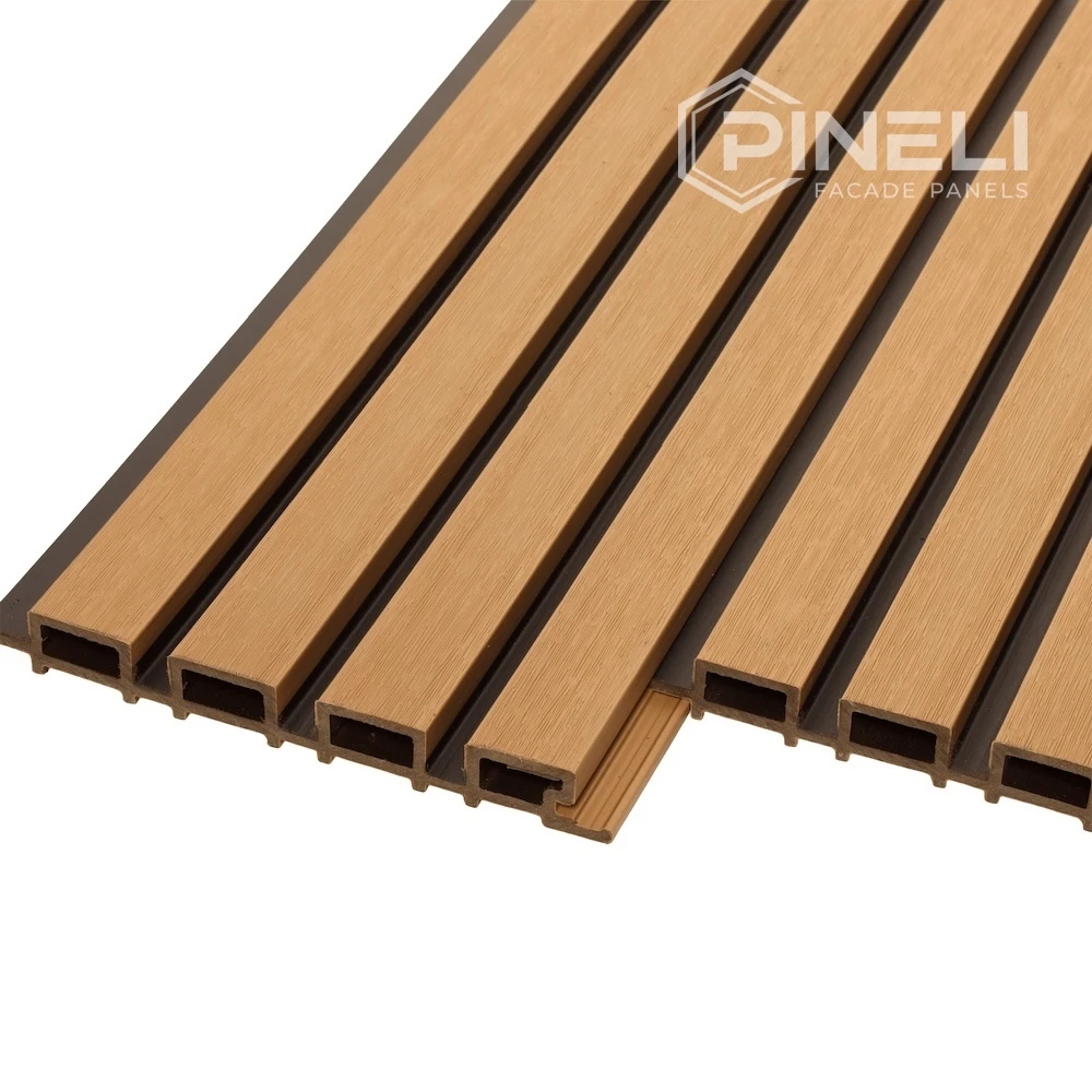 Фасадные панели Pineli Bicolor Savana (цвет: Савана) выполнены в виде реек, при этом имитирует древесную фактуру и цвета различных пород древесины. Уникальные расцветки панелей в сочетании двух цветов, где графитовый цвет между реек создает глубину и объем в любом пространстве, открывает безграничные возможности для игры с глубиной и объемом вашего фасада и проекта