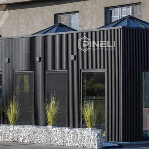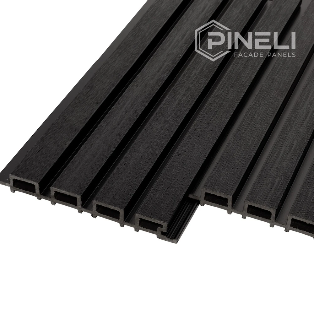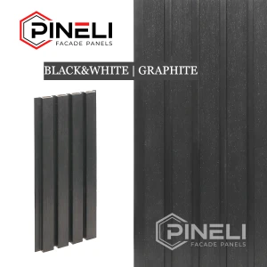Фасадные панели Pineli Grafit (цвет: Графит) выполнены в виде реек. Панели сочетает в себе простоту, элегантность и строгость. Это идеальное дизайнерское решение для для тех, кто хочет добавить в свой проект строгие темные цвета или элегантный светлый цвет клена.